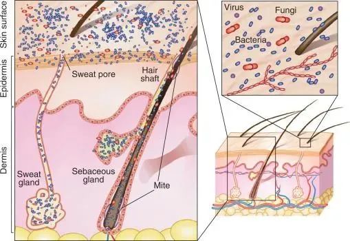 皮膚中存在250種微生物,他們以平均10萬個(gè)/平方厘米的密度分布在我們皮膚的表面。這些細(xì)菌可以被分為兩個(gè)大類:常駐菌群與暫住菌群。常駐菌群是永久定植在皮膚上的,大多人畜無害,擔(dān)任著保護(hù)皮膚不受其他病原體威脅的艱巨任務(wù),這類細(xì)菌的代表:如表皮葡萄球菌,痤瘡丙酸桿菌等。暫住菌群是由和外部的接觸或者皮膚感染的過程中,暫時(shí)降落在皮膚表面的細(xì)菌。由于長駐菌群的存在,這些暫住菌群一般不會(huì)對人體造成太多的威脅,除非他們直接降落在皮膚損傷的區(qū)域而引發(fā)炎癥和感染。