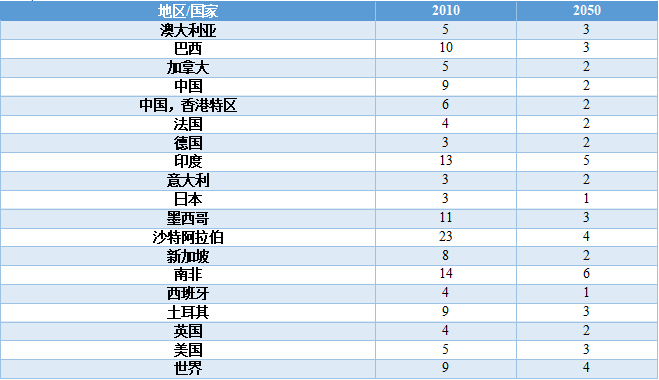 這個比率可以作為一個粗略的指標,說明每個潛在的老年受撫養(yǎng)人的潛在撫養(yǎng)人的數(shù)量(包括醫(yī)療費用)。在1950年,世界上每一個老年人口就有12個工作年齡人口。但到2010年,這個比例下降到9,最大的下降發(fā)生在較發(fā)達的國家。然而,中國和其他金磚四國經(jīng)濟體預計在2050年的老年人贍養(yǎng)率將接近或低于法國和美國等發(fā)達國家,這主要是因為這些發(fā)達國家具有穩(wěn)定的生育率和移民數(shù)量,可以將過去幾十年來下降的比率穩(wěn)定住。