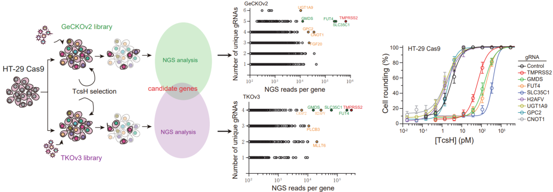 圖1. CRISPR/Cas9介導(dǎo)的全基因組敲除篩選發(fā)現(xiàn)與TcsH作用相關(guān)的宿主基因