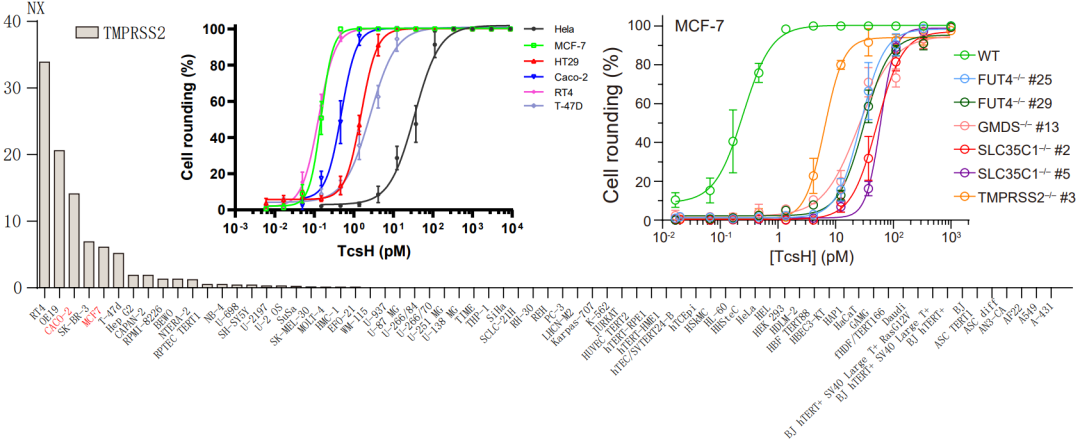 由于可參考的關(guān)于 TcsH 的先前研究相對(duì)稀少,團(tuán)隊(duì)在初期也遇到了不小的困難。其中一個(gè)難點(diǎn)就是合適的與毒素互作的靶向細(xì)胞的選擇。與其它 LCT 相比,TcsH 在很多常見細(xì)胞株上表現(xiàn)出來的毒性很弱。研究團(tuán)隊(duì)意識(shí)到篩選合適細(xì)胞系的重要性,于是測(cè)試了大量的不同組織來源的細(xì)胞系,多數(shù)人源細(xì)胞系對(duì) TcsH 都不敏感,但研究中也發(fā)現(xiàn)了兩株特定的細(xì)胞,人結(jié)腸癌細(xì)胞系 HT-29 和人結(jié)直腸癌細(xì)胞系 Caco-2,對(duì) TcsH 高度敏感?;谶@一發(fā)現(xiàn),團(tuán)隊(duì)選取了 HT-29 細(xì)胞作為研究 TcsH 的模式細(xì)胞,并且為了提高成功率,選擇兩個(gè)不同來源的人源 sgRNA 文庫(kù)在 HT-29 細(xì)胞上構(gòu)建敲除文庫(kù)。通過 TcsH 壓力篩選,研究者們發(fā)現(xiàn)這兩個(gè)獨(dú)立的篩選系統(tǒng)同時(shí)富集了一系列共同的靶向基因,包括跨膜絲氨酸蛋白酶2(TMPRSS2 )及巖藻糖基化修飾相關(guān)基因 GMDS、SLC35C1、FUT4(圖1)。通過構(gòu)建基因突變和回補(bǔ)細(xì)胞,研究者們證明這些基因?qū)?TcsH 的細(xì)胞侵入起了重要作用。