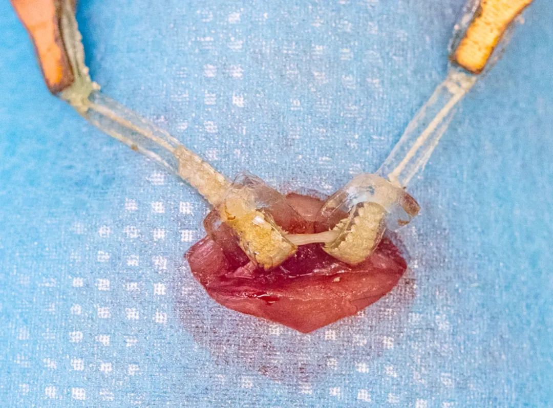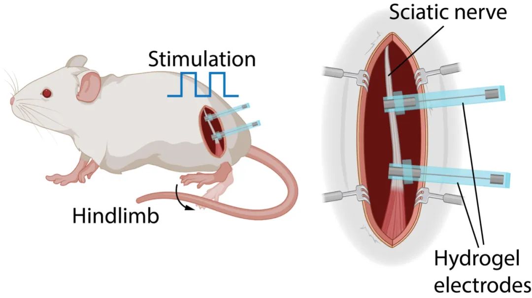 而這套方法的“終極目標(biāo)”,就是和生命體進(jìn)行直接的“連接”,而這一點(diǎn)也在小鼠實(shí)驗(yàn)上得到了非常成功的效果。實(shí)驗(yàn)團(tuán)隊(duì)制備了可用于提供電刺激的全水凝膠電極,可以通過簡(jiǎn)單的手術(shù)纏繞在小鼠的坐骨神經(jīng)上。在1Hz頻率的脈沖式電壓刺激下,3D打印電極可在低達(dá)100mV的電壓下引起小鼠腿部的規(guī)律大角度運(yùn)動(dòng)。而作為對(duì)照的離子導(dǎo)電水凝膠的電極則在250mV的的驅(qū)動(dòng)電壓作用下也只可勉強(qiáng)引發(fā)小鼠腿部微小的運(yùn)動(dòng)。