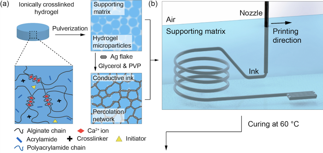 而研究團(tuán)隊(duì)把這兩種水凝膠的固化分成了兩個(gè)獨(dú)立步驟——先固化海藻酸鈣,然后再“打碎”細(xì)化成為微凝膠微顆粒。這種凝膠顆粒中除了海藻酸鈣還包含了丙烯酰胺單體、交聯(lián)劑和自由基引發(fā)劑,粒徑在20微米左右,可以作為3D打印的“墨水”。打印完成后,再通過加熱引發(fā)聚丙烯酰胺的固化,讓電子器件最終定型。